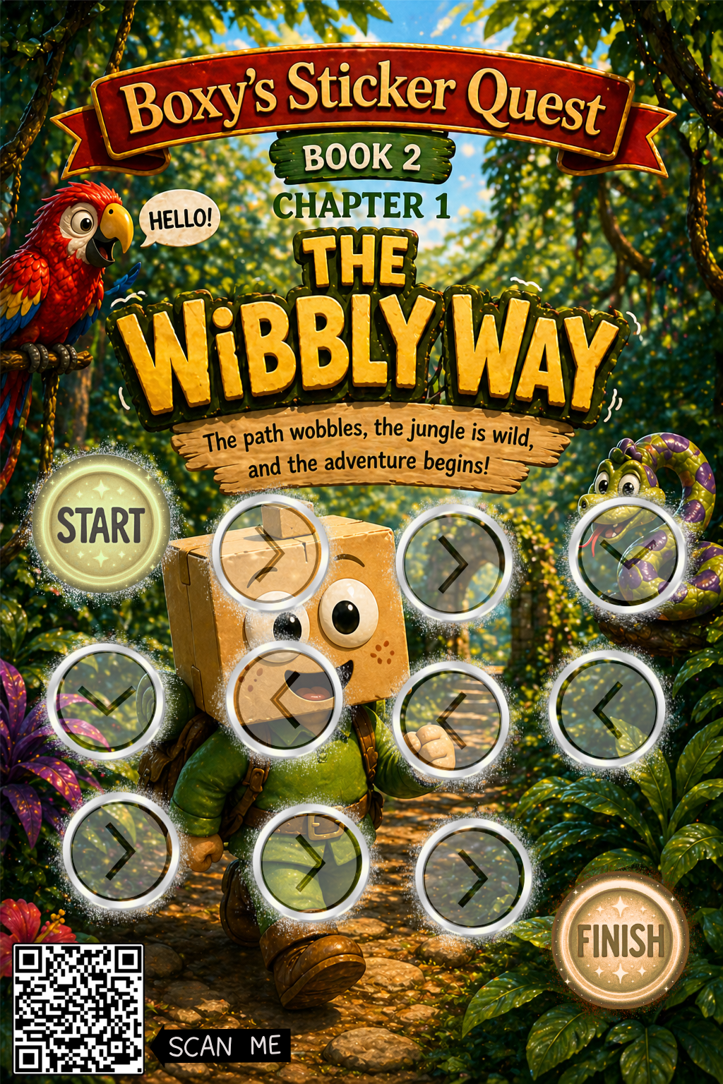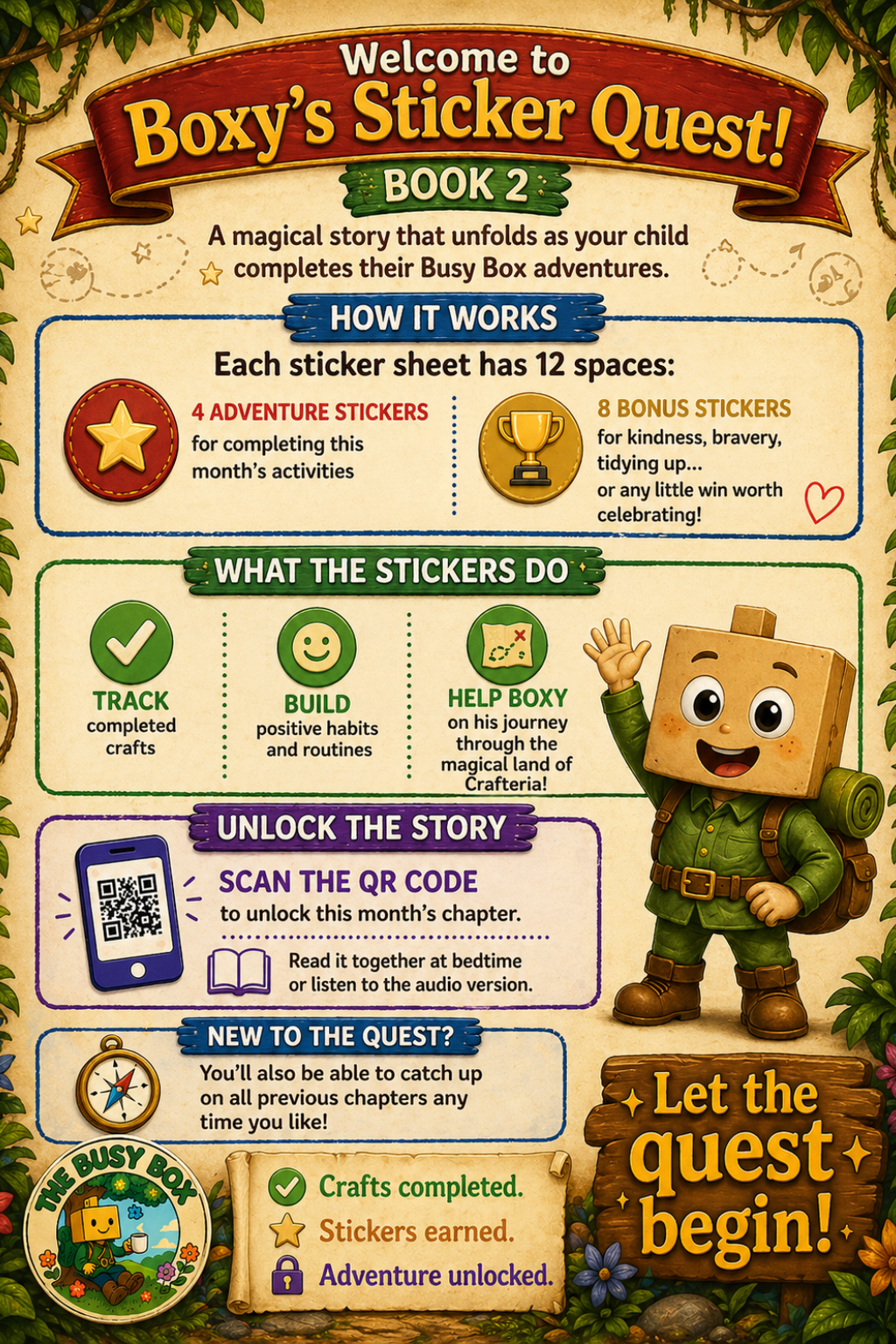 📱 Scan the QR code on the sheet to jump straight into that month’s chapter of Boxy’s Sticker Quest.